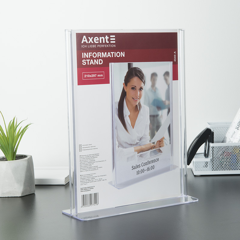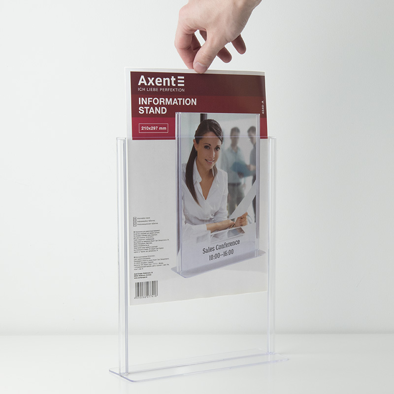 Двосторонні інформаційні таблички широко використовуються для розміщення реклами та іншої інформації при роботі з клієнтами - в банках, ресторанах (наприклад, спеціальні меню), на рецепції готелів, в салонах краси і т.д. Табличка інформаційна двостороння Axent виготовлена з кришталево прозорого пластику (полістиролу), який не порушує передачу кольору і чіткість зображень. Зручна виїмка для пальців дозволяє легко замінити вкладиш в табличці.