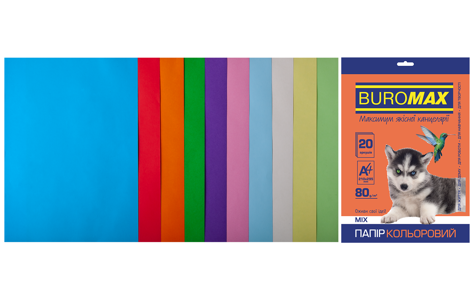 Двосторонній кольоровий папір BUROMAX – для життя, для роботи, для навчання, для творчості, для дому! Переваги: • Висока насиченість та однорідність кольору • Широкий асортимент кольорів та міксів кольорів • Пофарбований по всій масі – кольоровий, в тому числи, на зрізі • Абсолютно безпечний для використання як дорослими, так і дітьми з наймолодшого віку – папір не містить важких металів та токсичних елементів*. Границі міграції хімічних елементів з кольрового паперу не перевищують норми, дозволені для дитячих іграшок, що підтверджено відповідними документами! Характеристики: • формат А4; • щільність: 80 (g / m2); • упаковка кожного набору має захисний клапан на клейовій основі, який призначений для багаторазового використання та забезпечує безпечне зберігання та транспортування набору протягом всього періоду роботи з папером; • упаковка: пакет з міцної прозорої плівки з повнокольоровим друком та європідвісом. Універсальний папір для використання у всіх сферах життя: • ДРУК: можливий двосторонній друк на домашній та професійній техніці: кольоровий лазерний друк, струменевий друк, виготовлення кольорових копій, друк білим тонером на темному папері • РЕКЛАМА: для створення яскравих друкованих рекламних оголошень • РОБОТА: для систематизації документів за змістом, розділами або відділами за допомогою кольорів • НАВЧАННЯ: для оформлення наукових робіт, рефератів, дипломів тощо • РОЗВИТОК ДИТИНИ ТА ТВОРЧІСТЬ: для різноманітних поробок з паперу, в тому числі, для квілінгу, завдяки профарбованості по всій масі, в тому числі, на зрізі • ОФОРМЛЕННЯ: для цікавих декорацій, запрошень на свята або визначні події, оформлення приміщень Папір BUROMAX – Розфарбуй свої ідеї в прекрасні кольори життя!